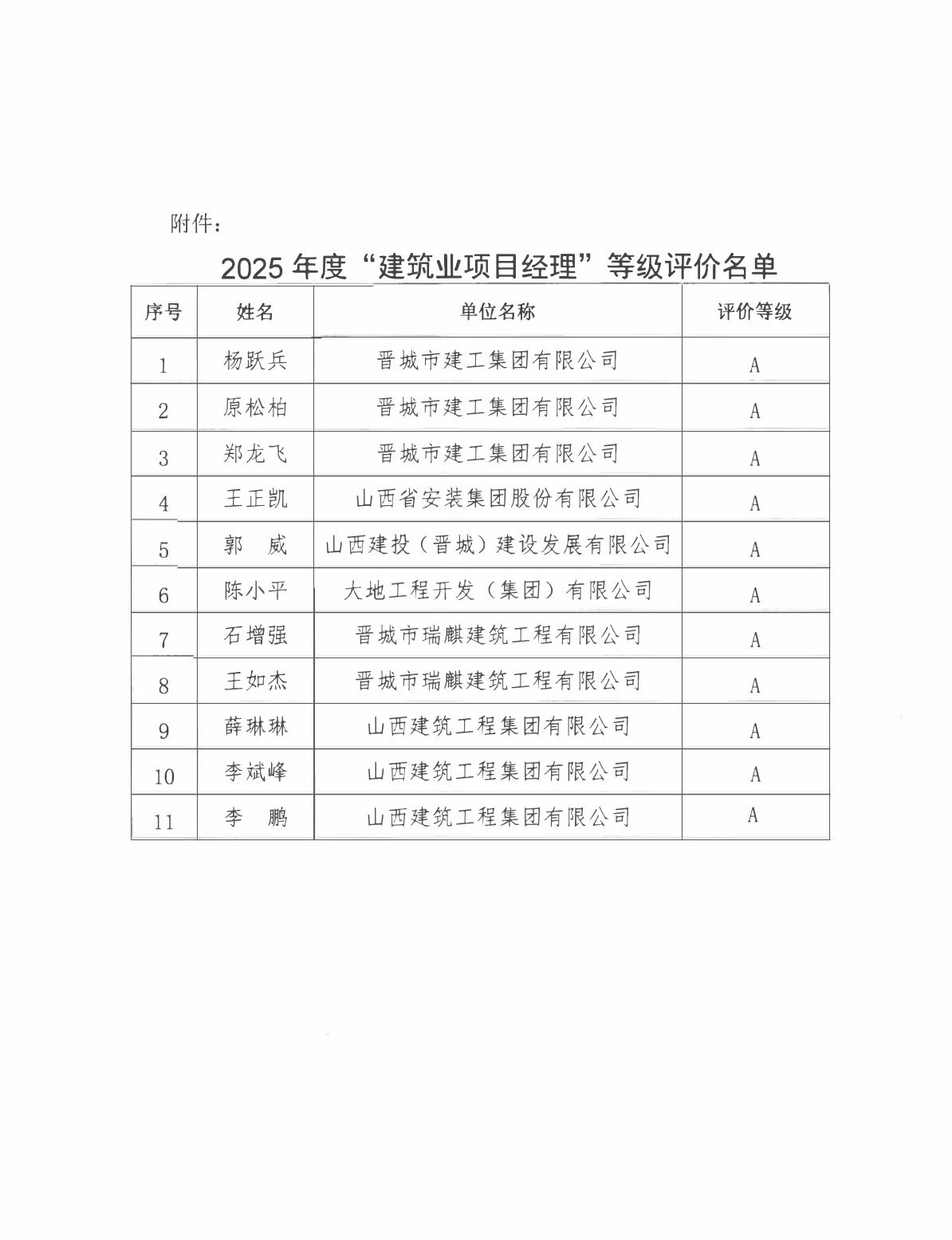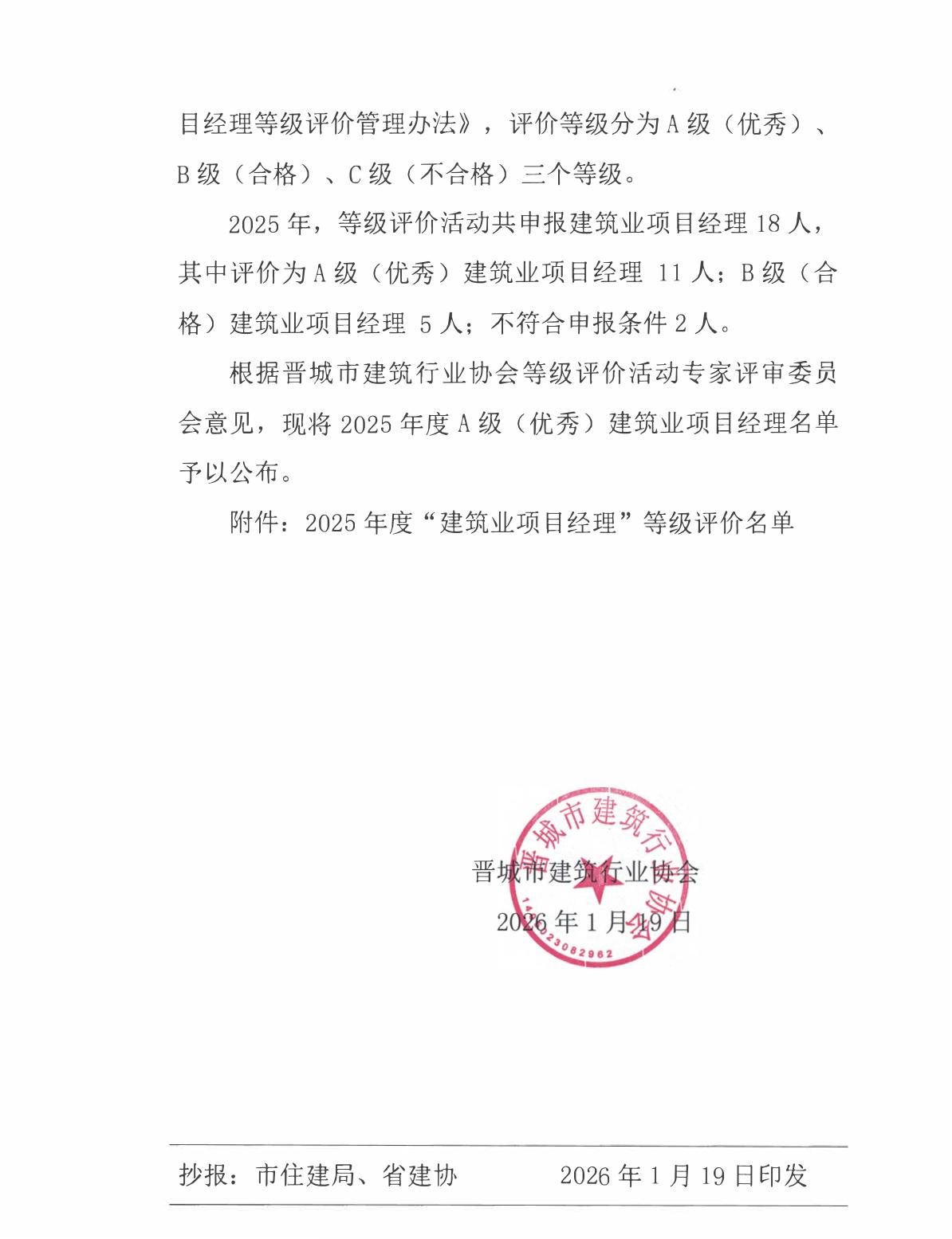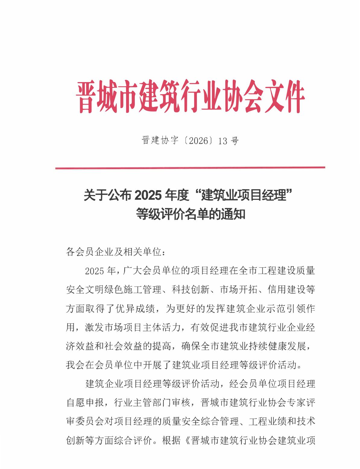 关于公布2025年度建筑业项目经理等级评价名单的通知
