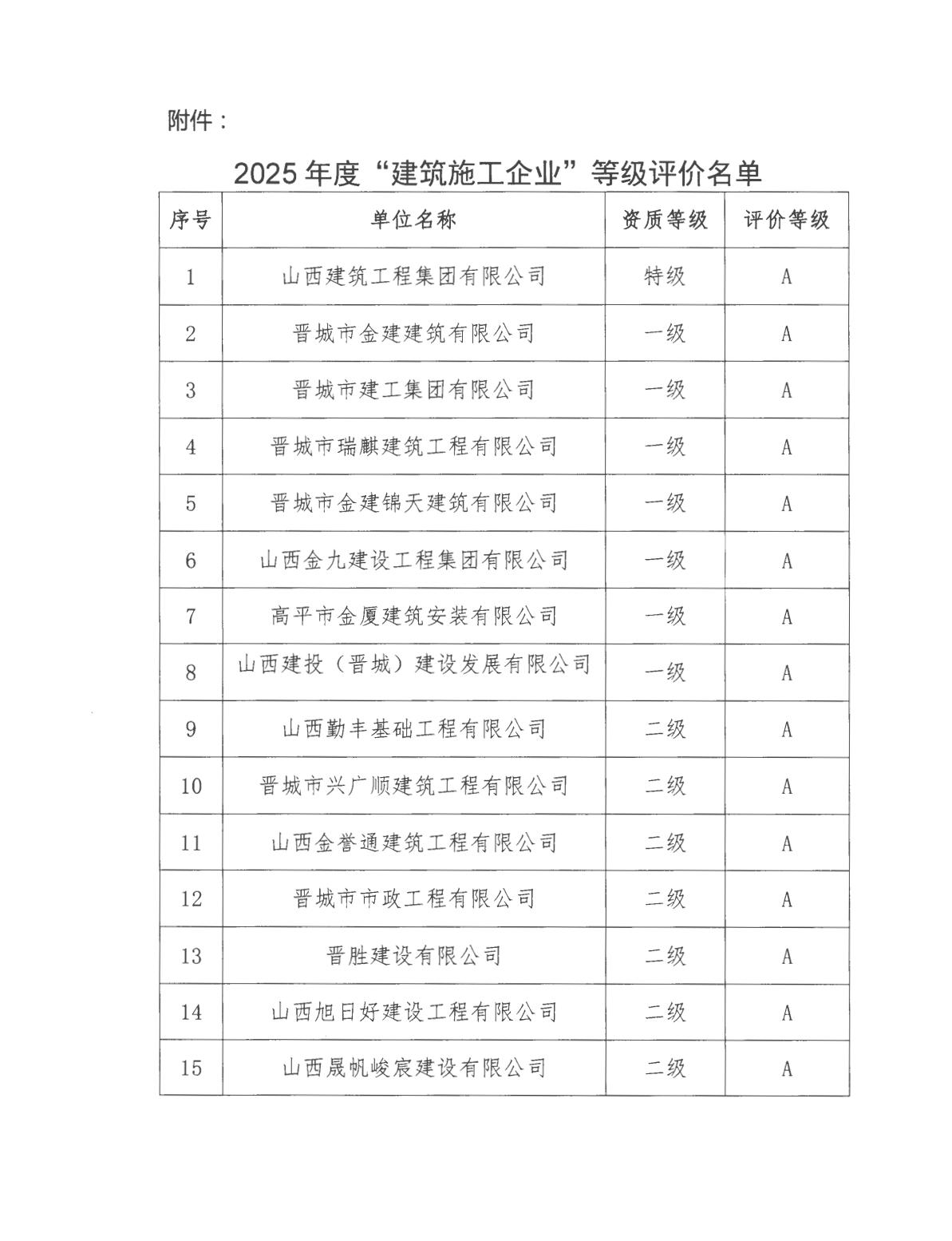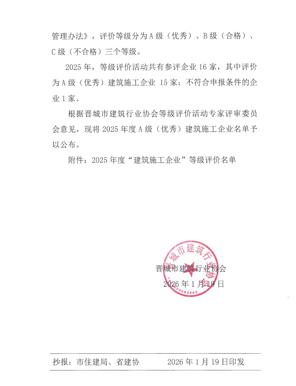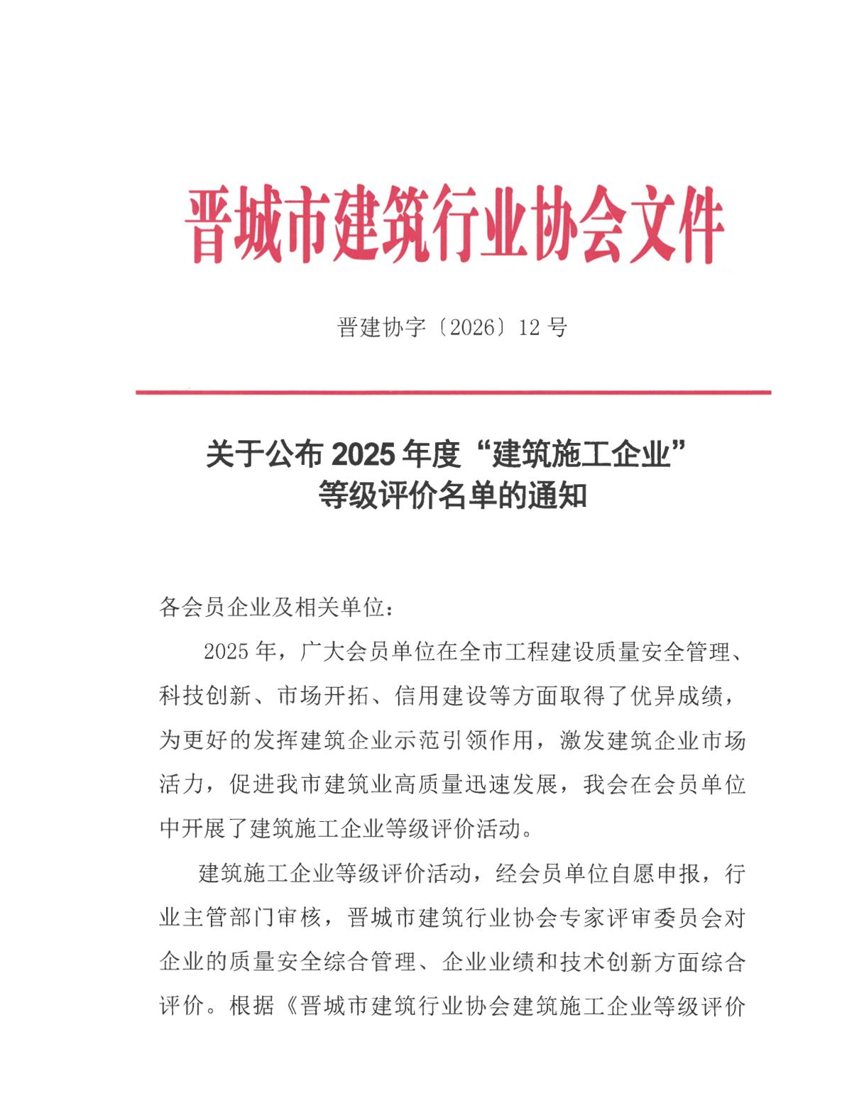 关于公布2025年度建筑施工企业等级评价名单的通知