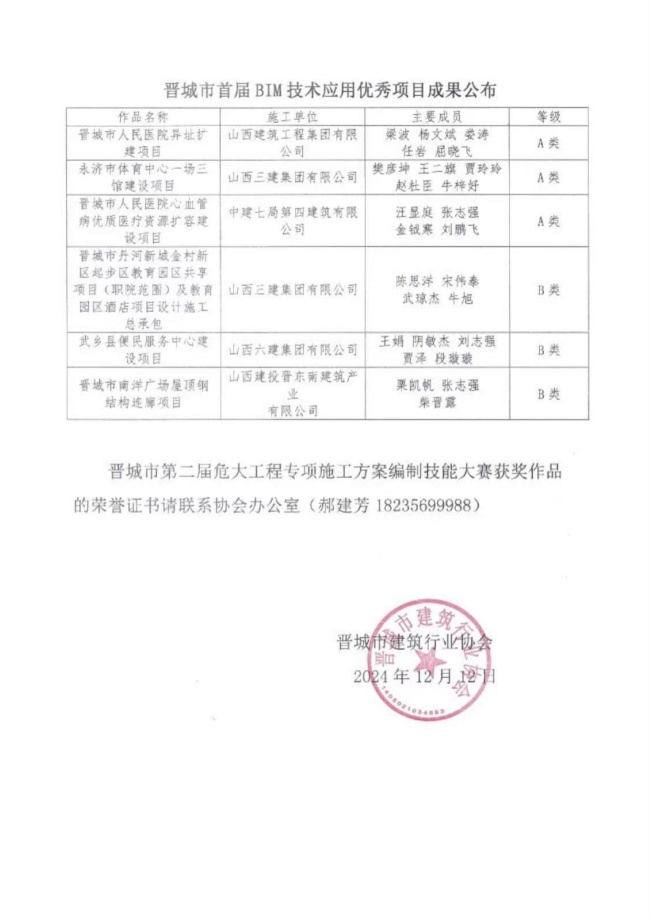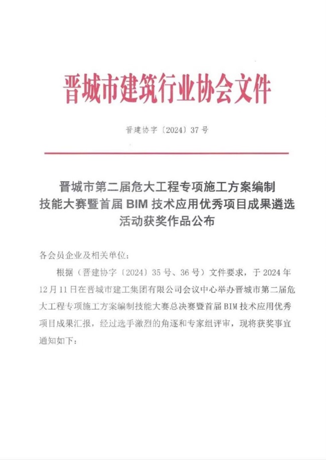 晋城市第二届危大工程专项施工方案编制技能大赛暨首届BIM技术应用******项目成果遴选活动获奖作品公布