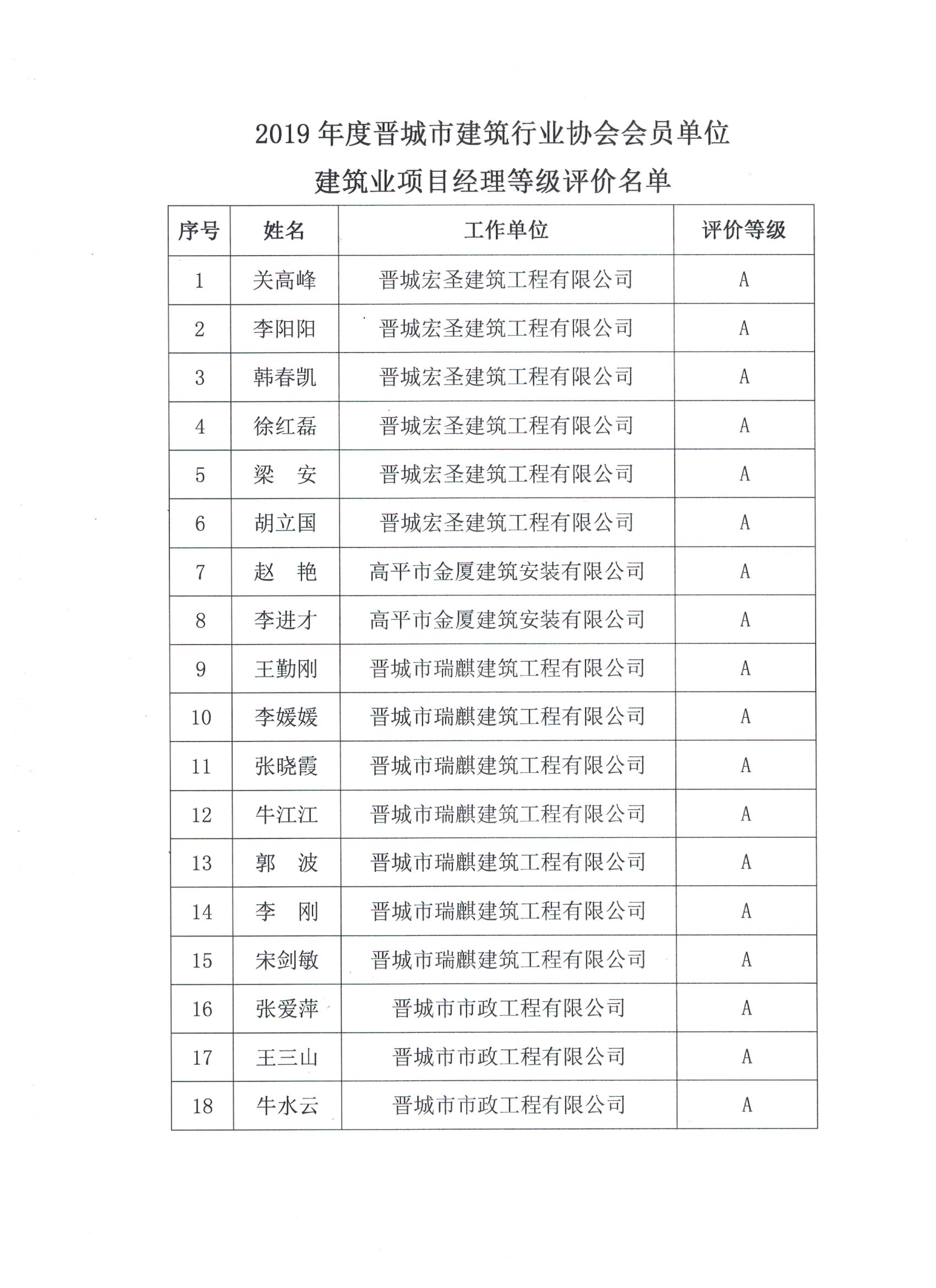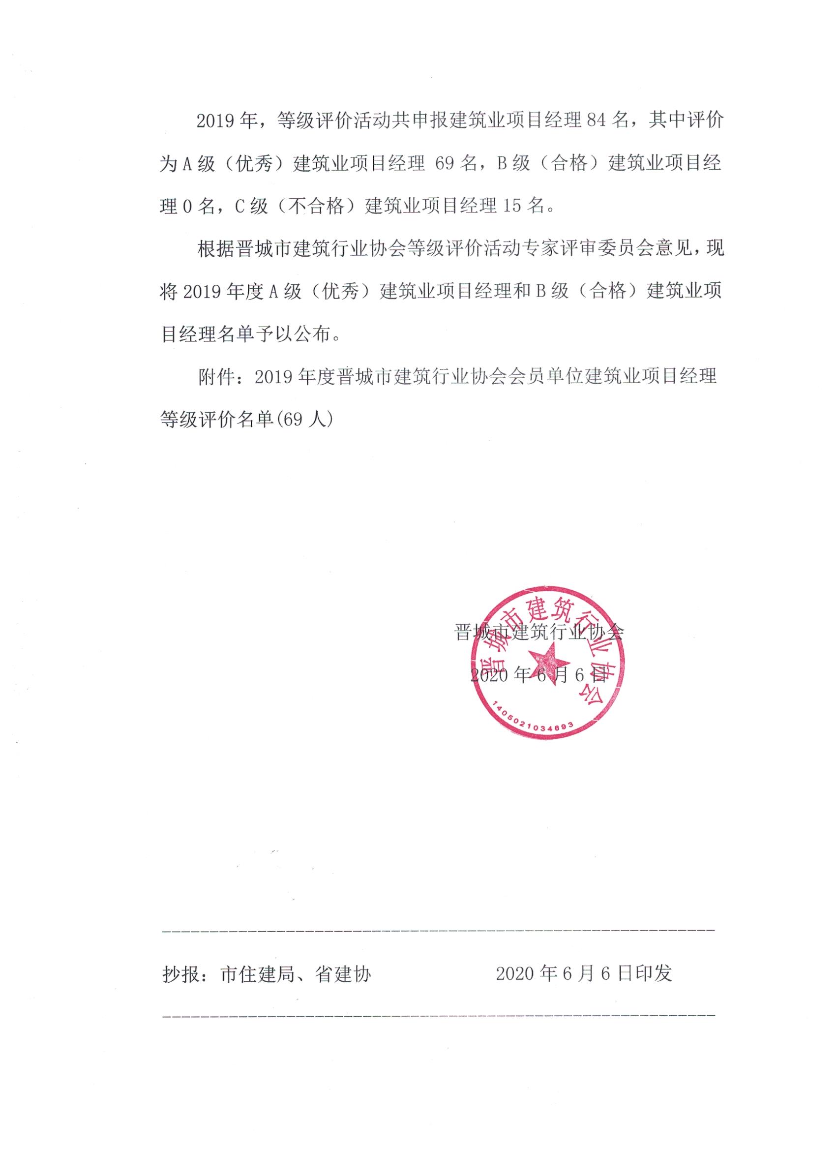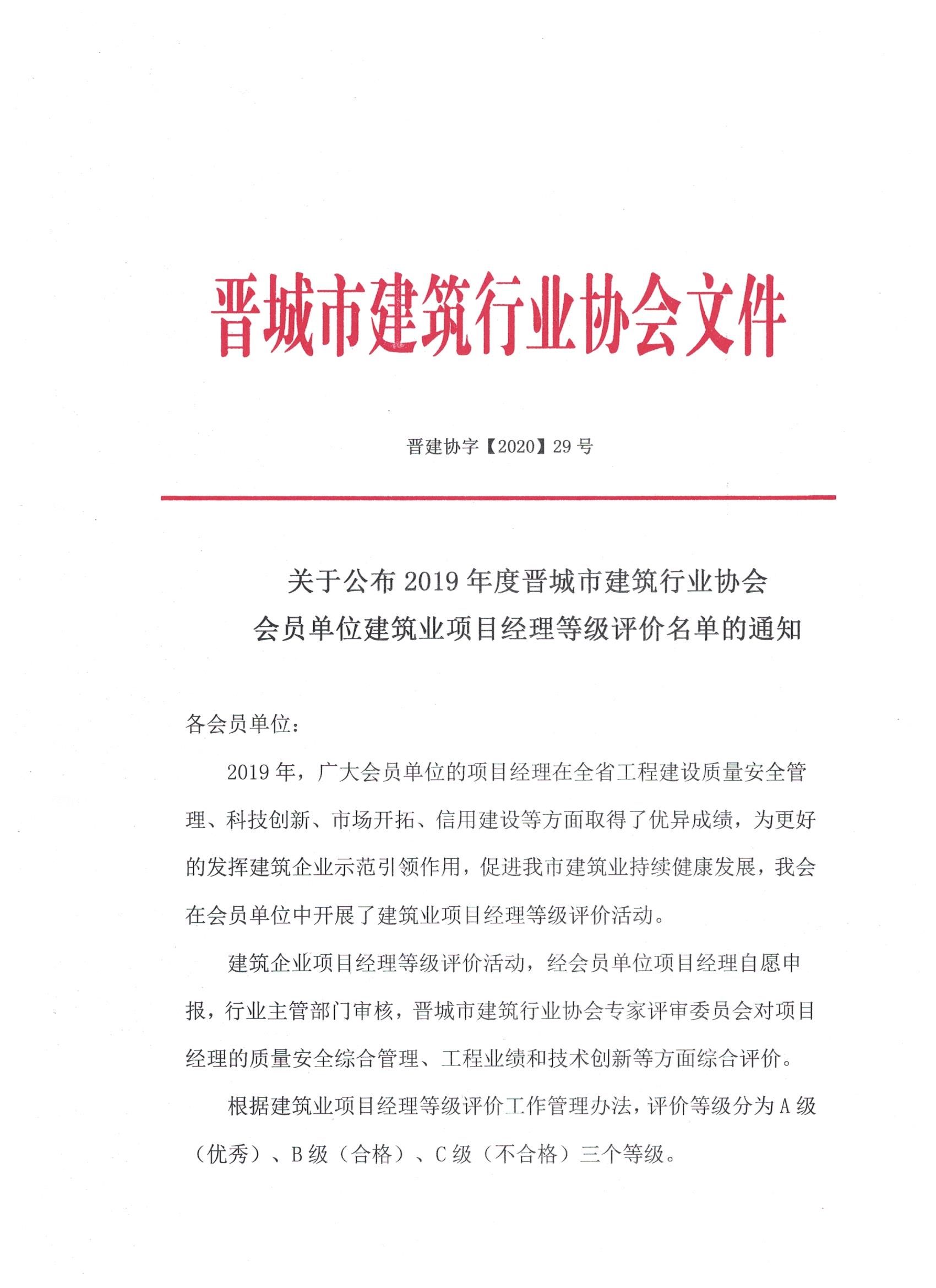 关于公布2019年度晋城市建筑行业协会会员单位建筑业项目经理等级评价名单的通知