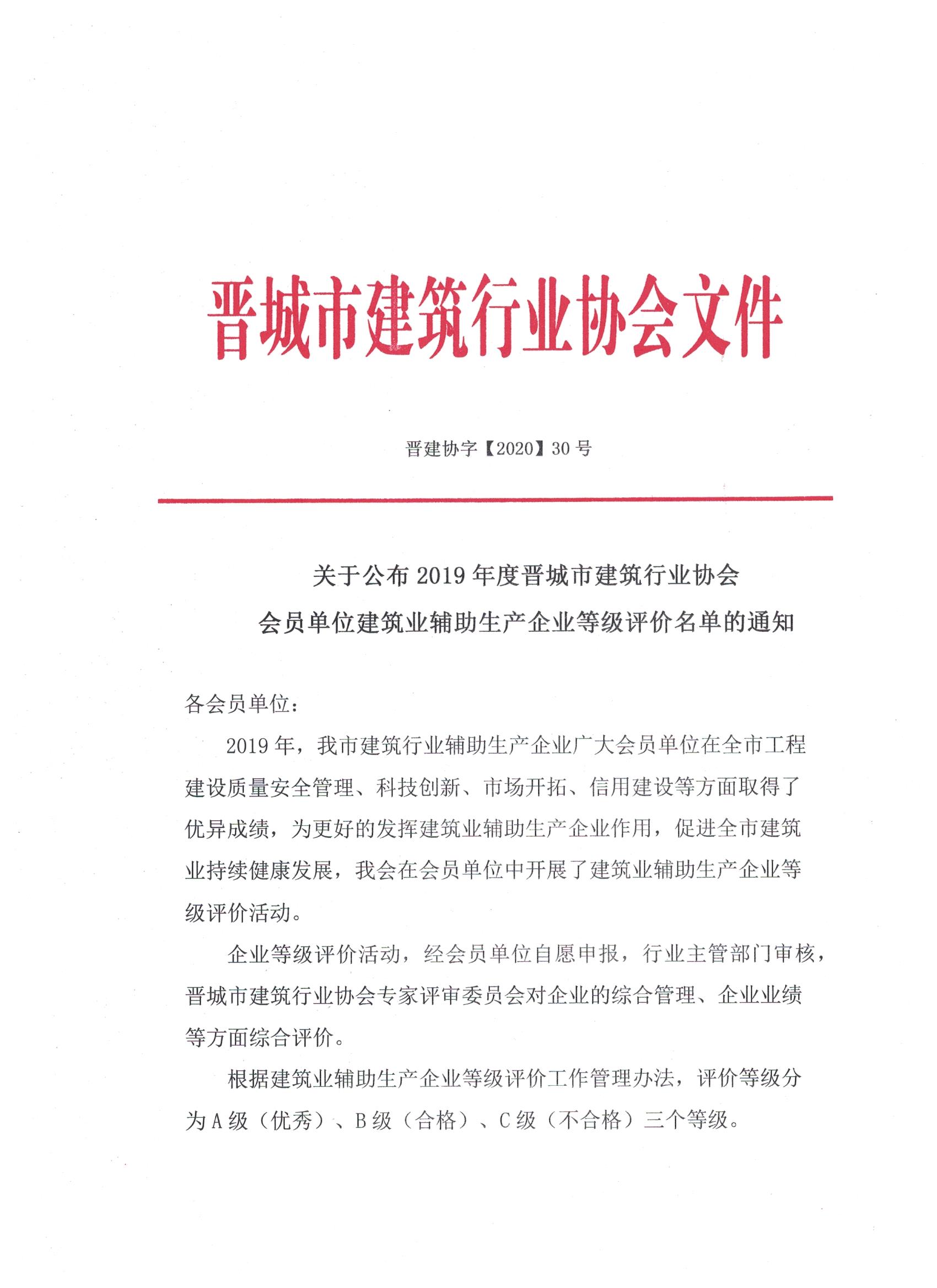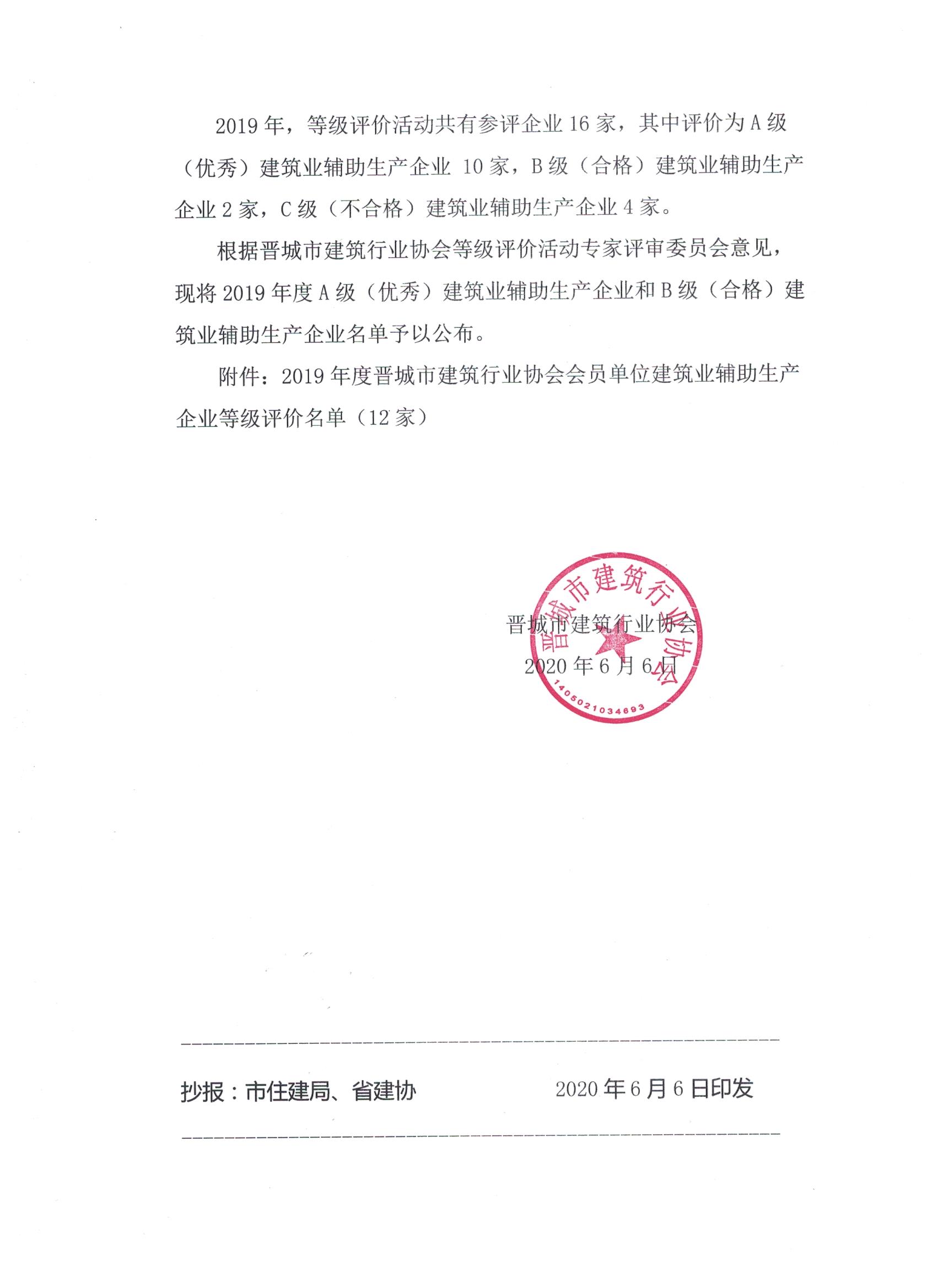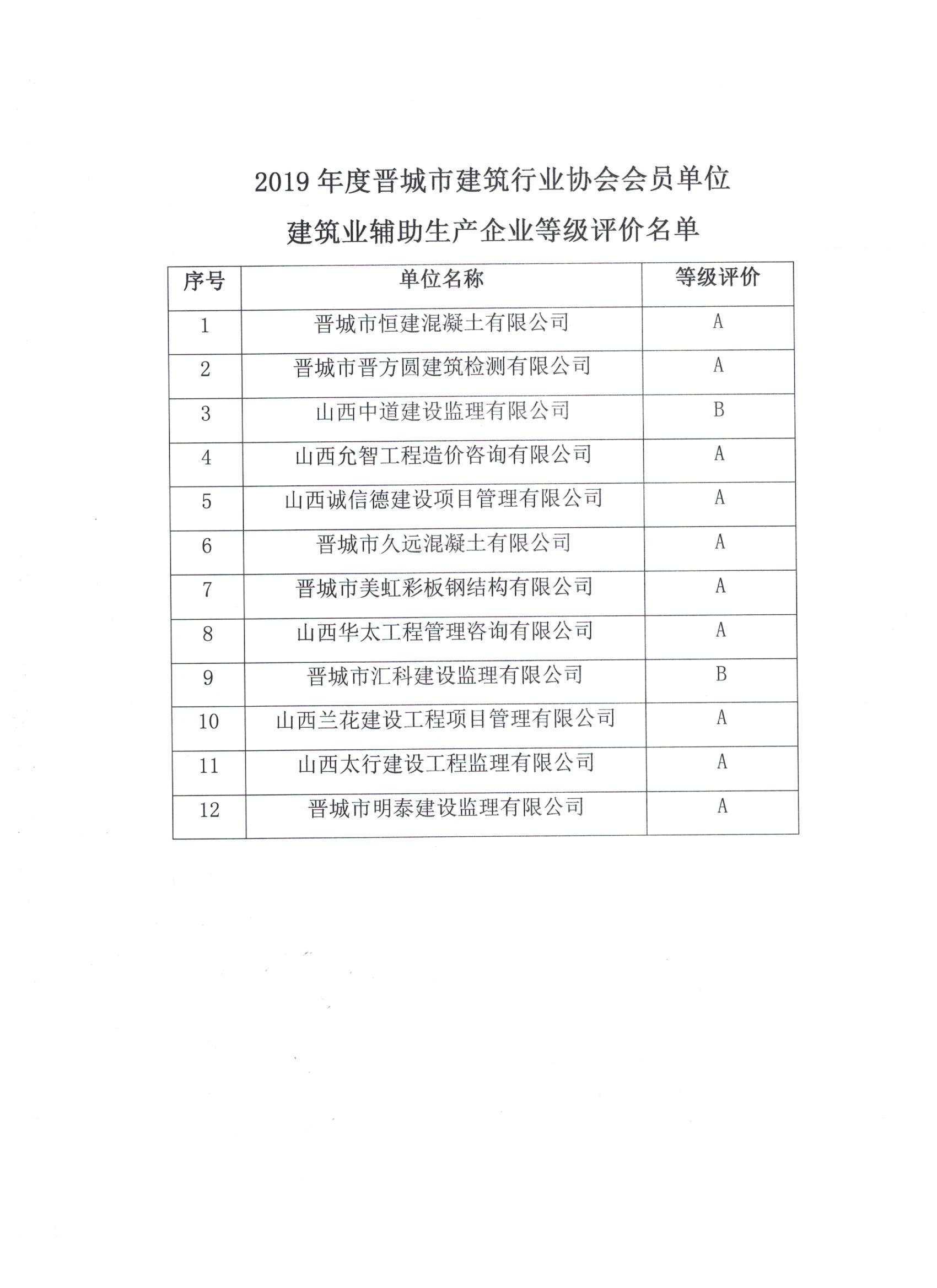 关于公布2019年度晋城市建筑行业协会会员单位建筑业辅助生产企业等级评价名单的通知