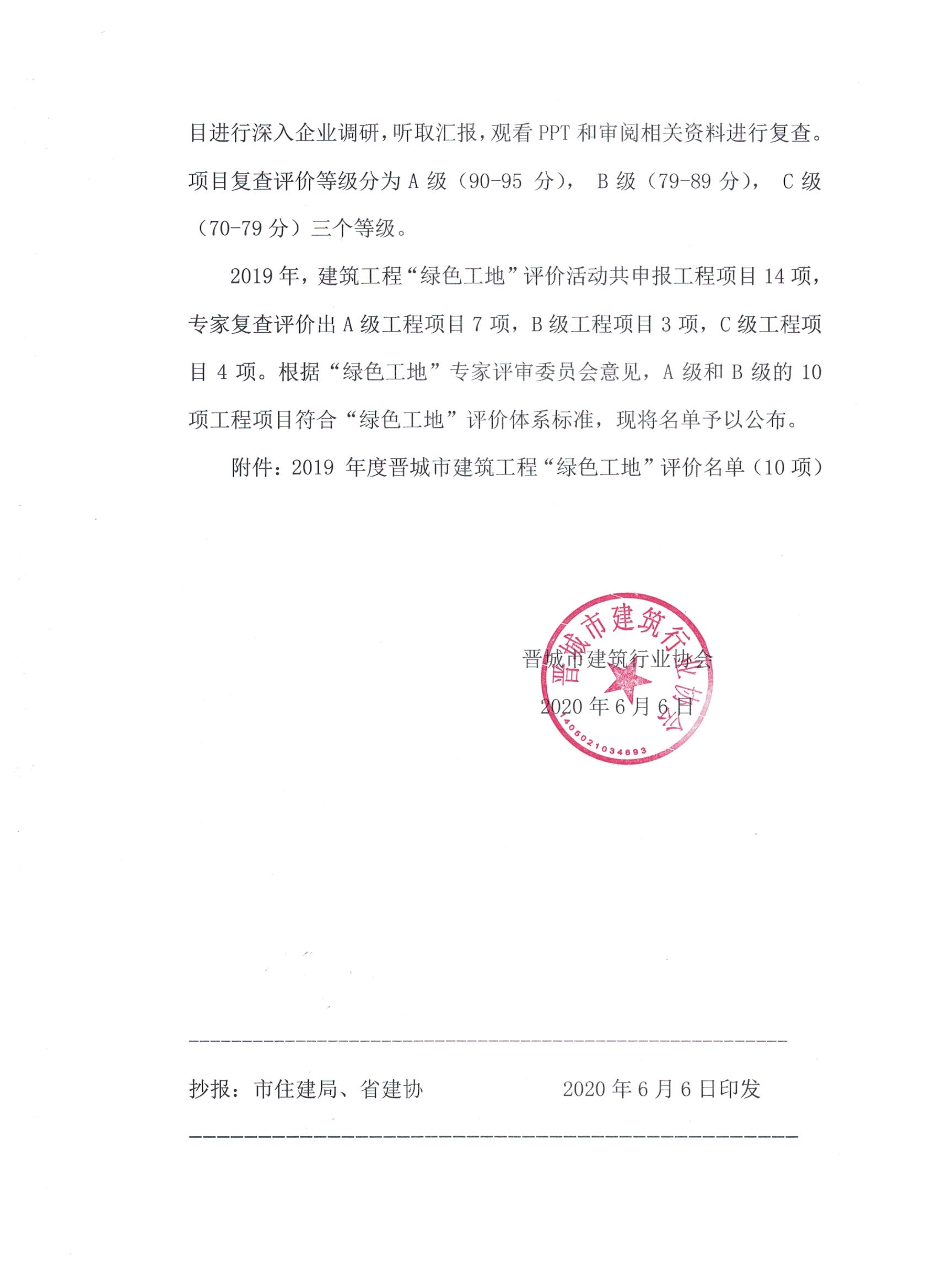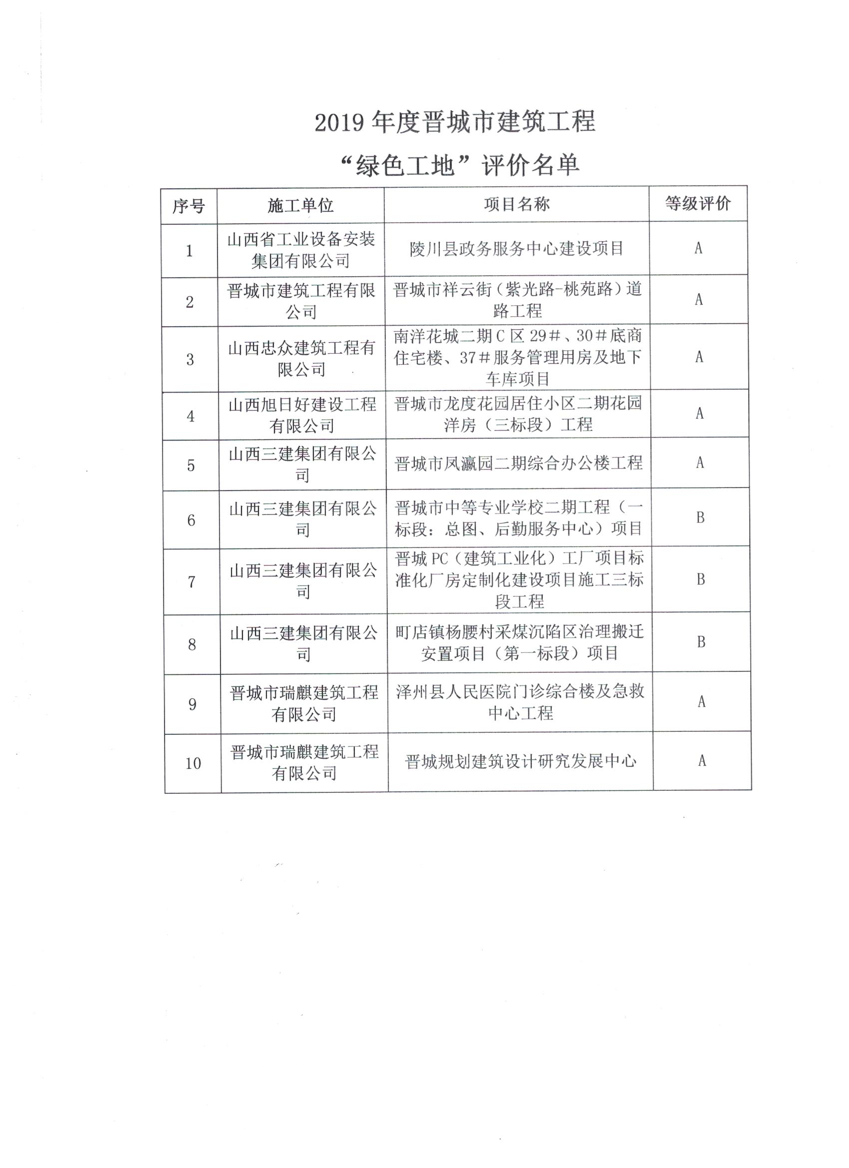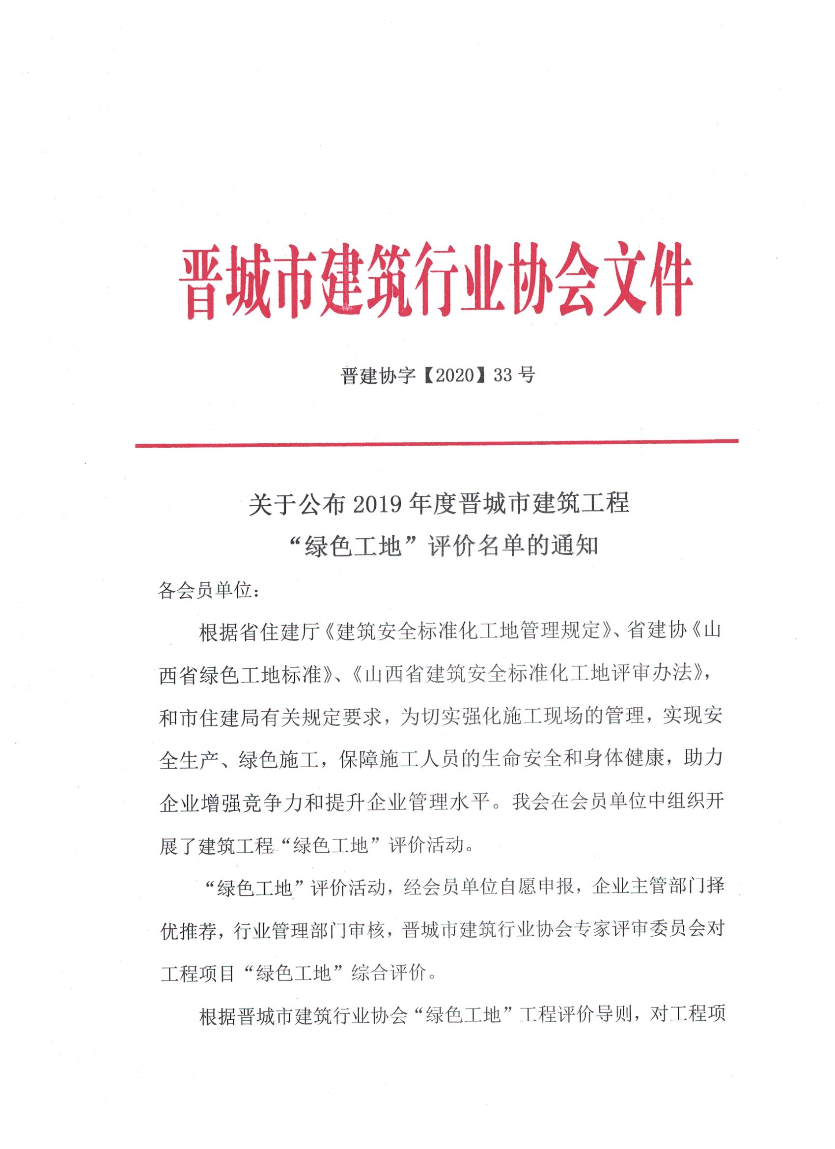 关于公布2019年度晋城市建筑工程“绿色工地”评价名单的通知