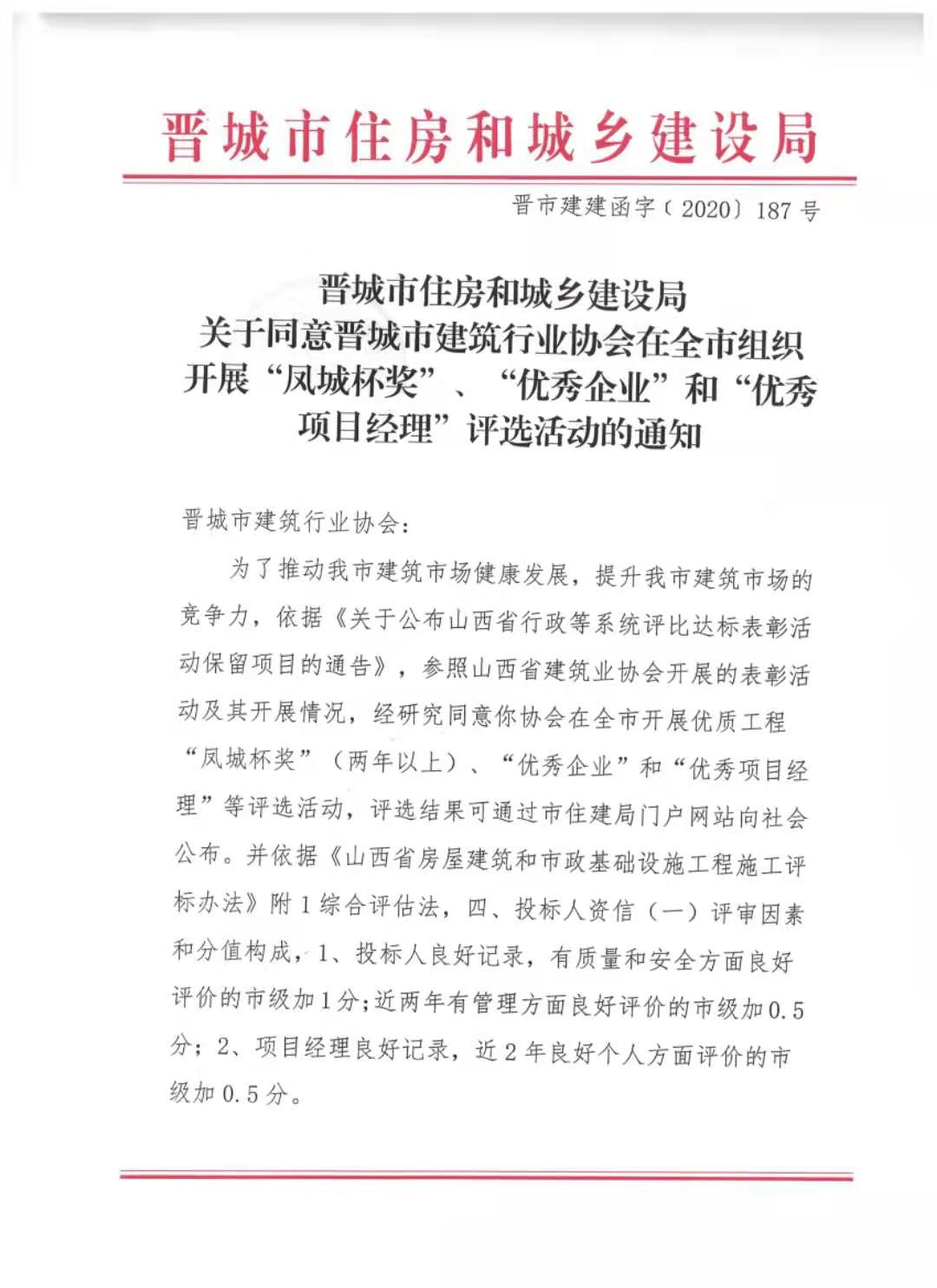 现将市住建局《关于同意晋城市建筑行业协会在全市组织开展建设工程质量“凤城杯奖”、“******企业”、“******项目经理”评选活动的通知》晋市建建函字【2020】187号文转发给你们,望接此通知后,请各会员单位认真对待,根据协会下发的有关申报办法和要求,积极组织申报,务于本月25日前将 “******企业”、“ ******项目经理”、工程质量“凤城杯奖”、“文明工地”、“绿色工地”申报资料报送我会。