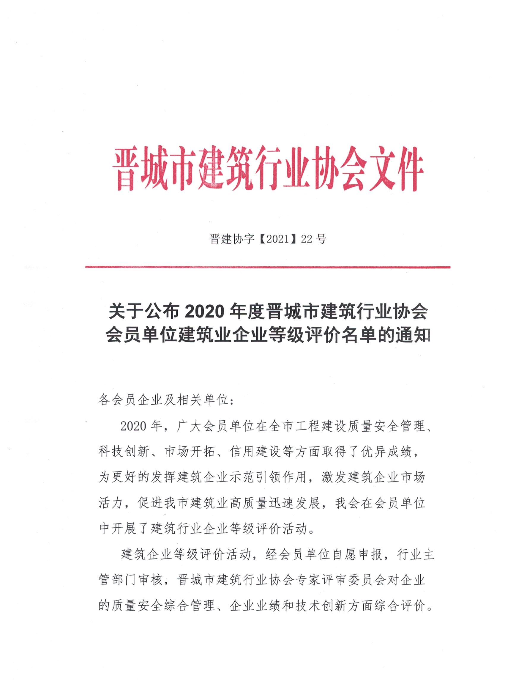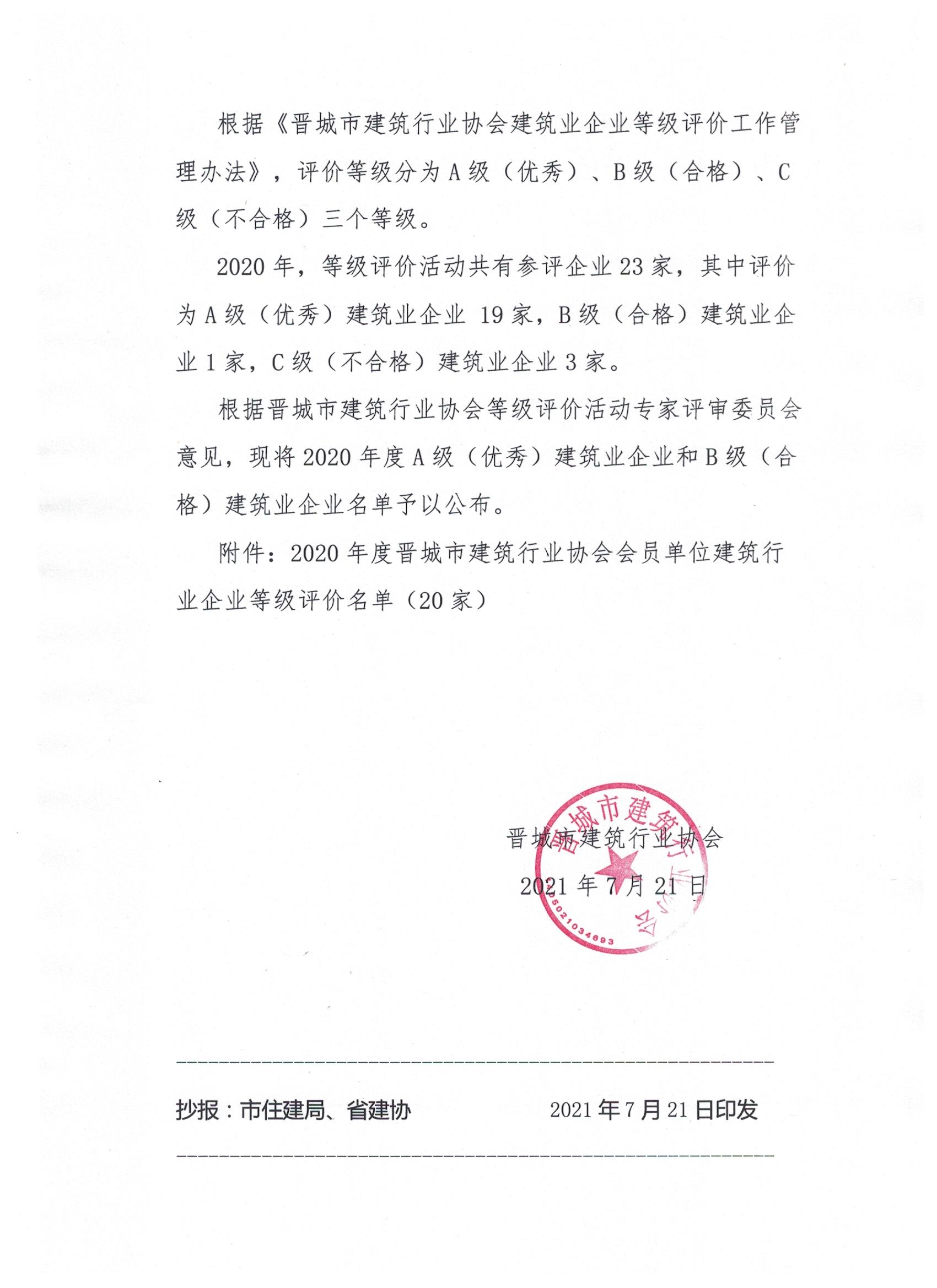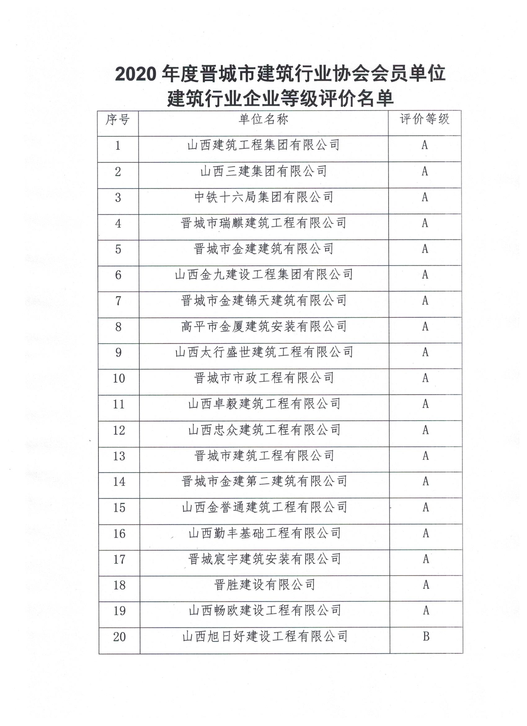 关于公布2020年度晋城市建筑行业协会会员单位建筑业企业等级评价名单的通知