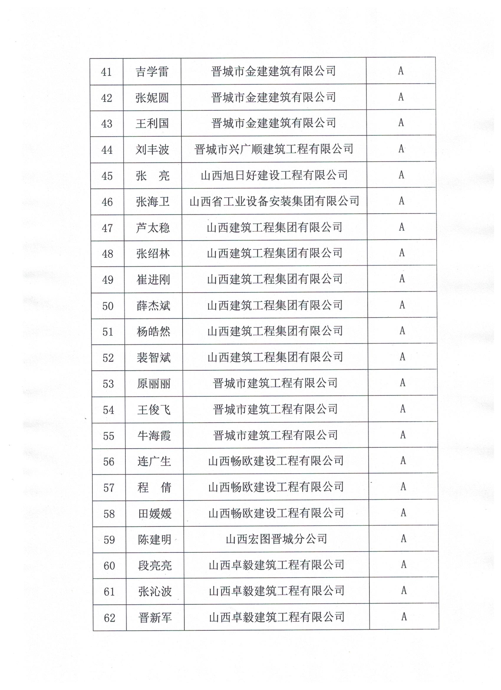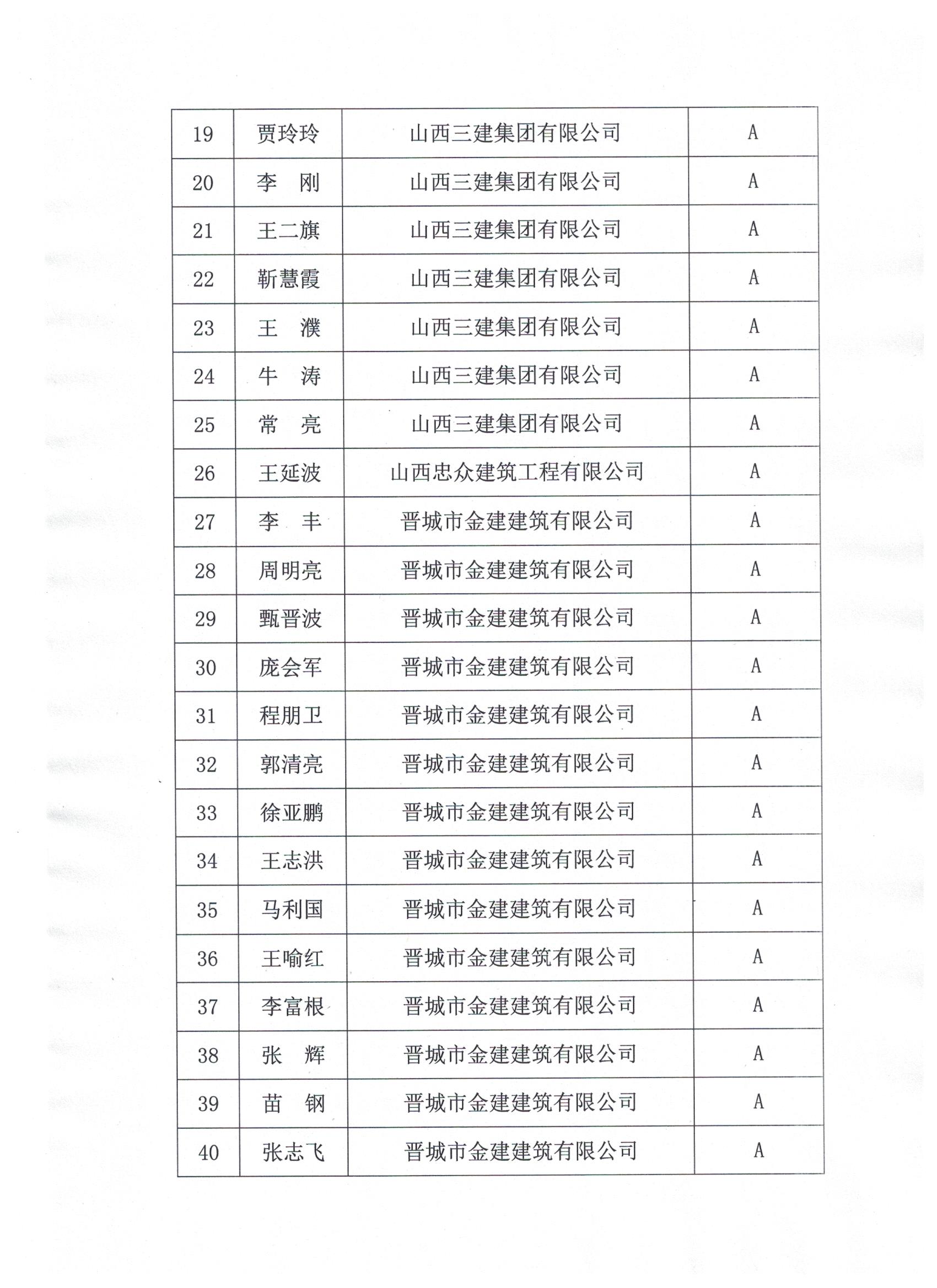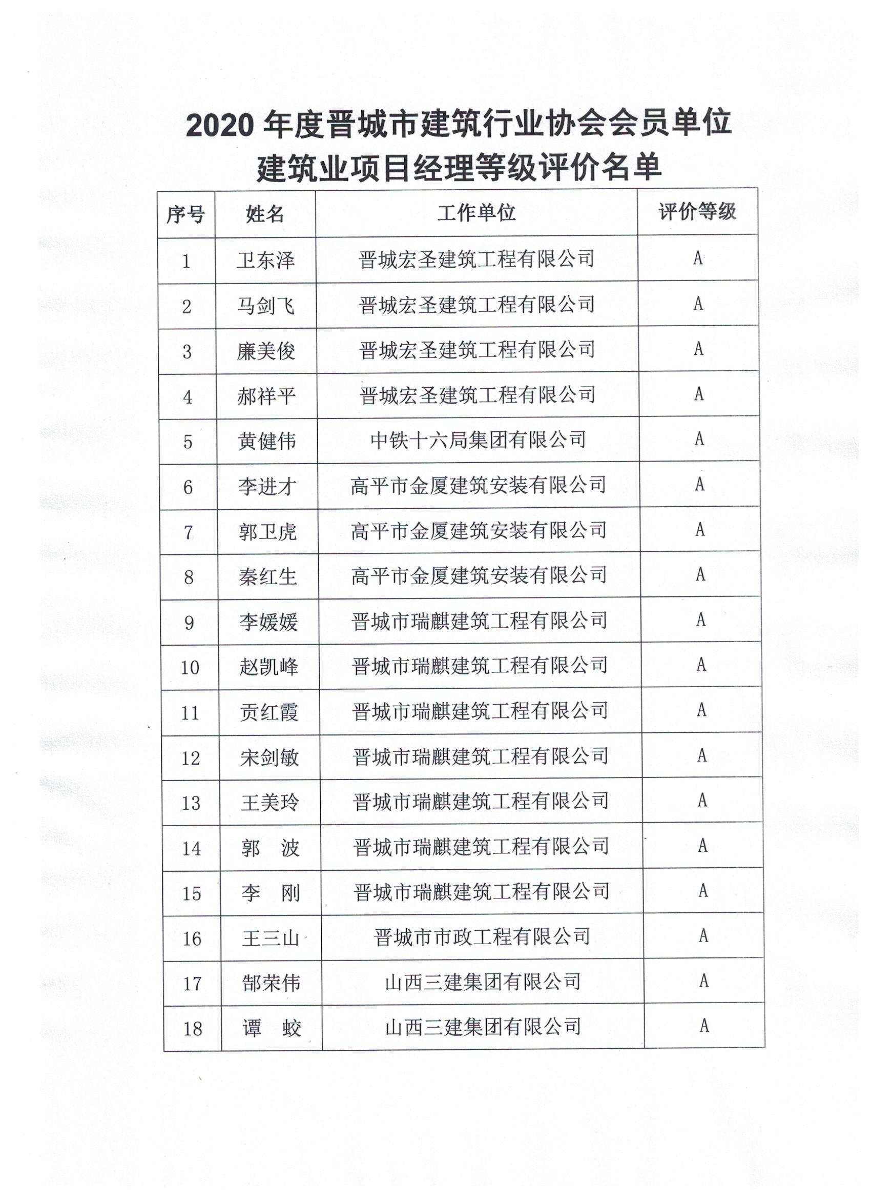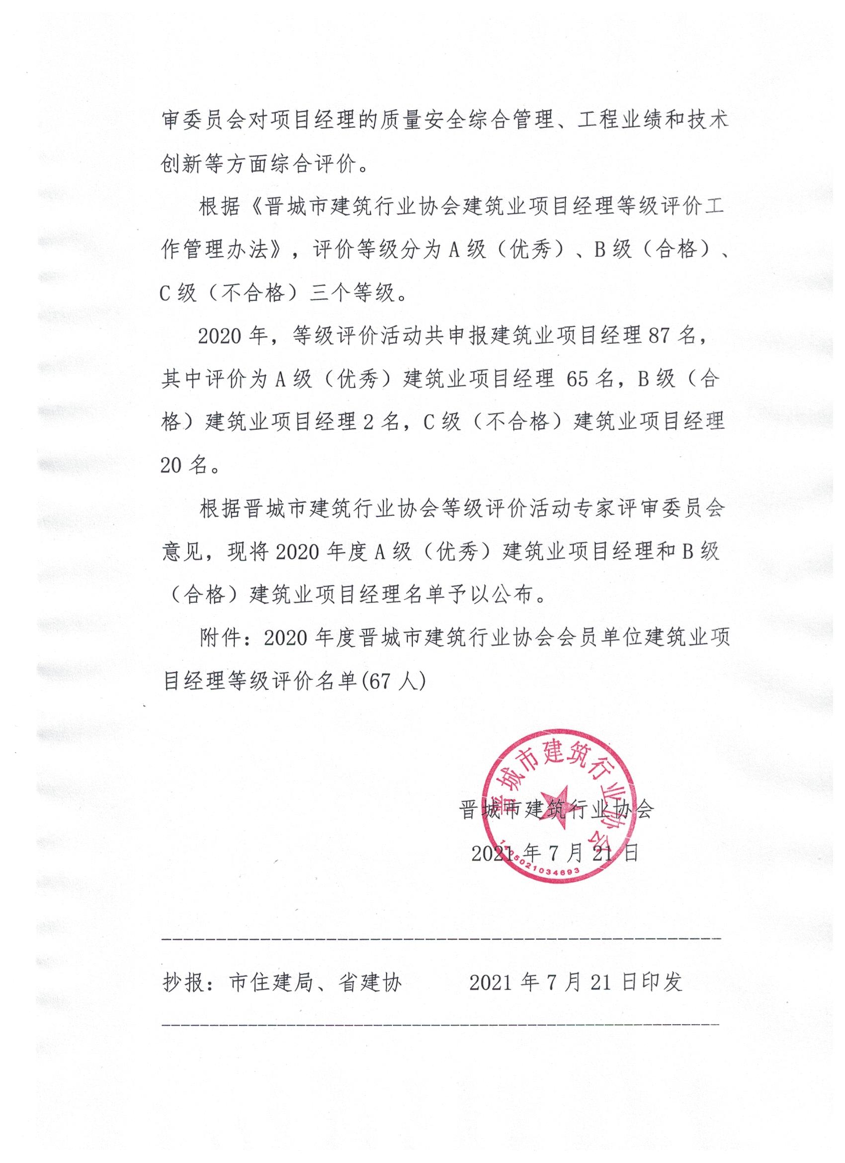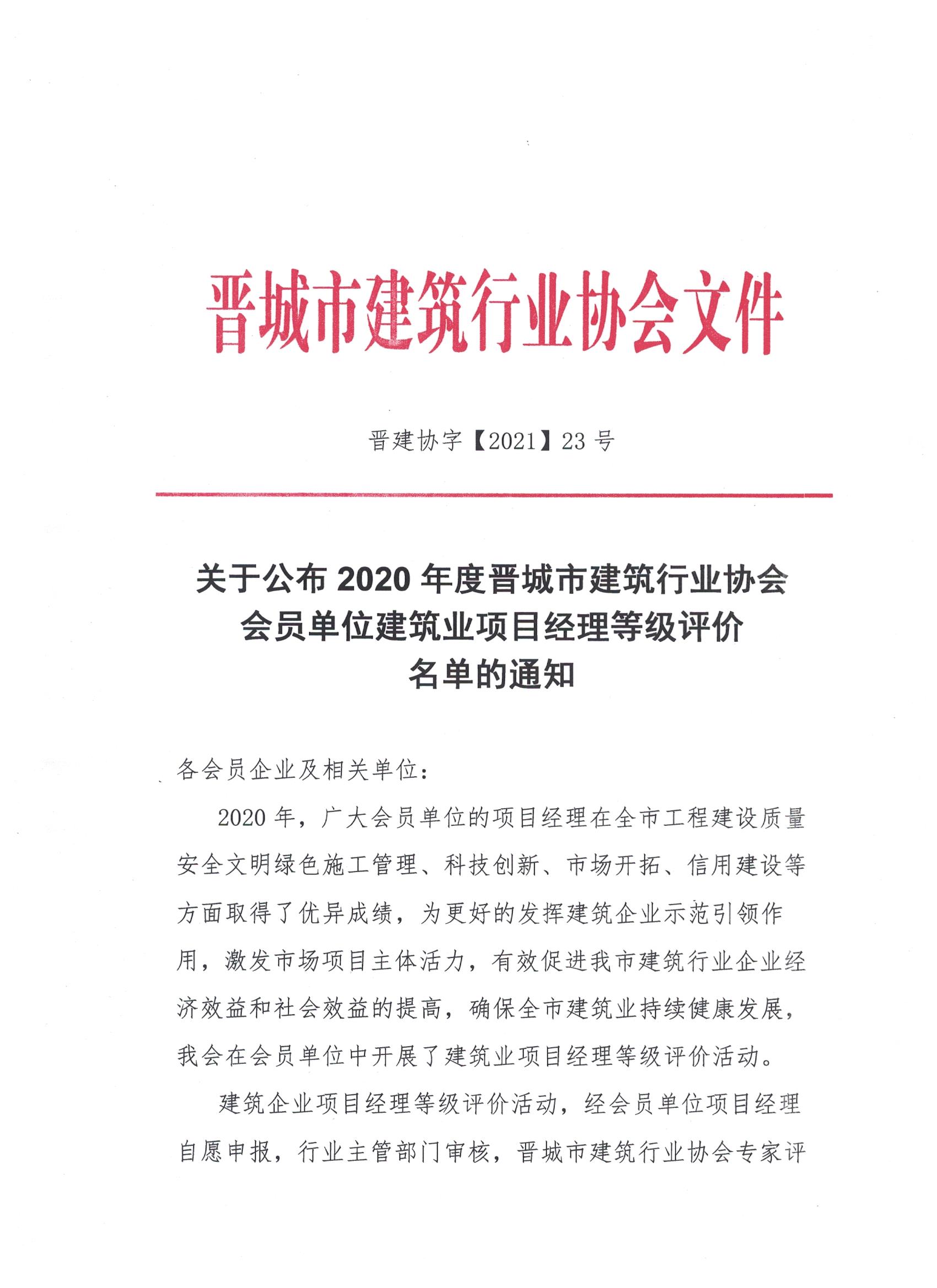 关于公布2020年度晋城市建筑行业协会会员单位建筑业项目经理等级评价名单的通知