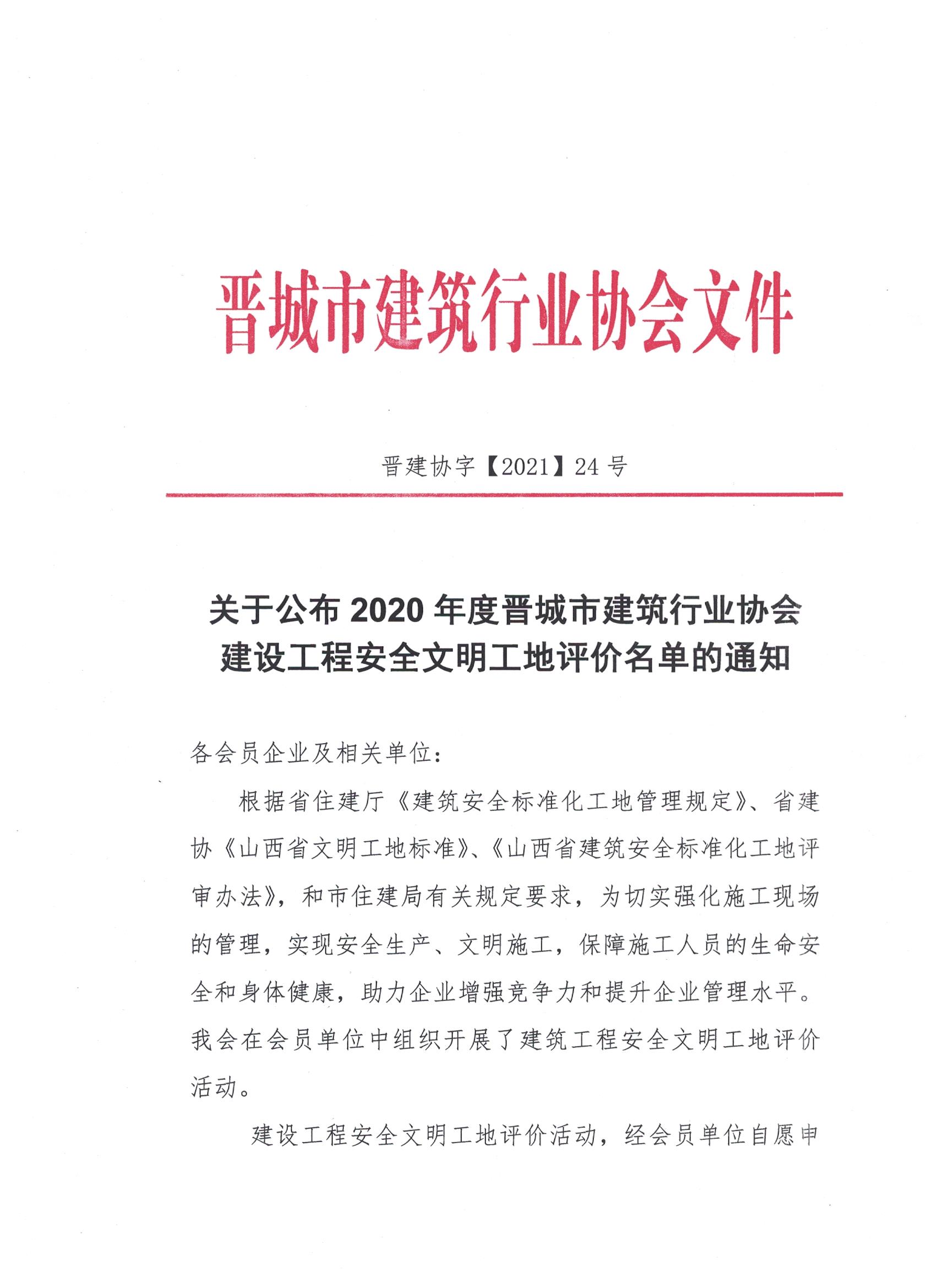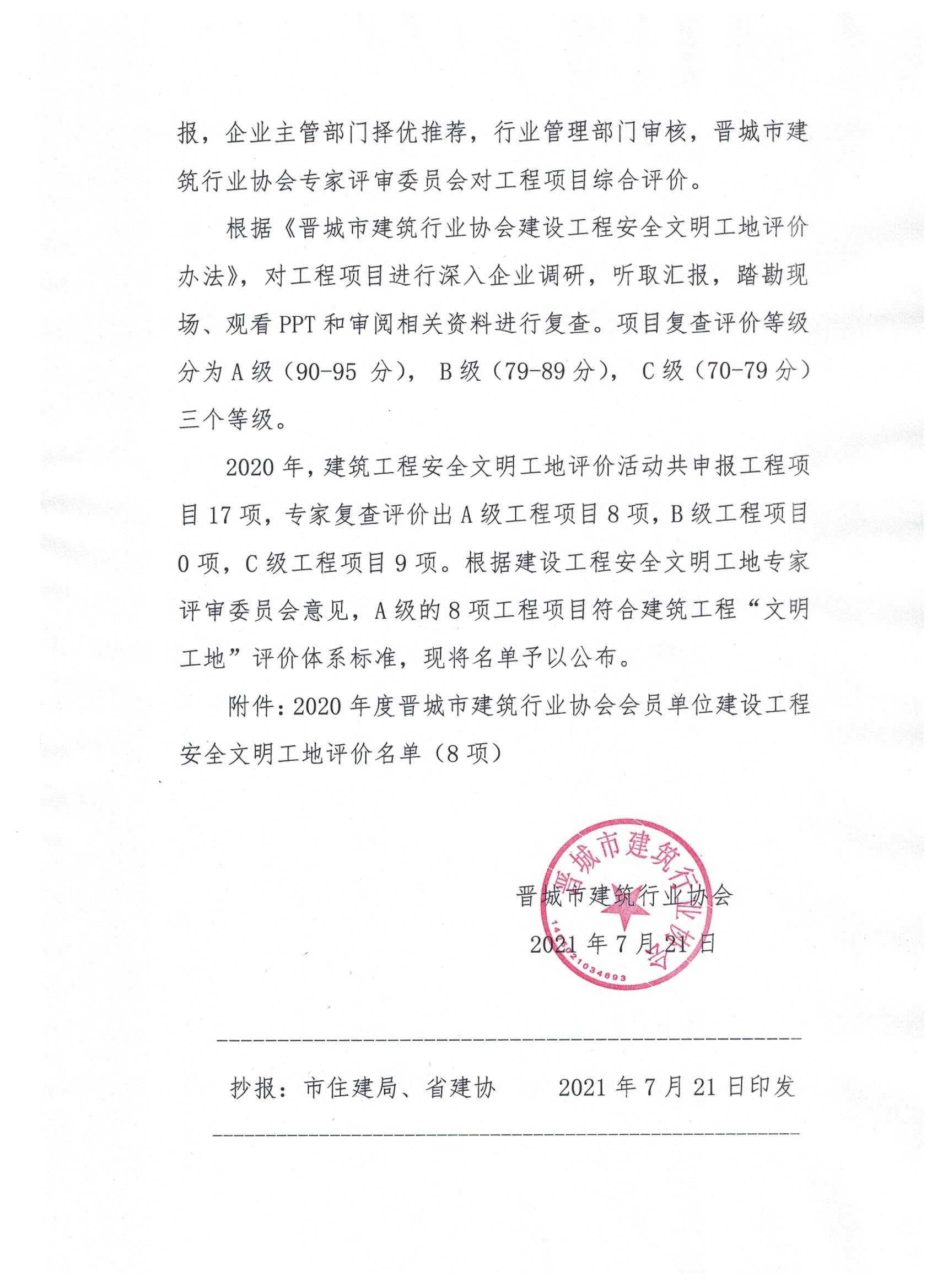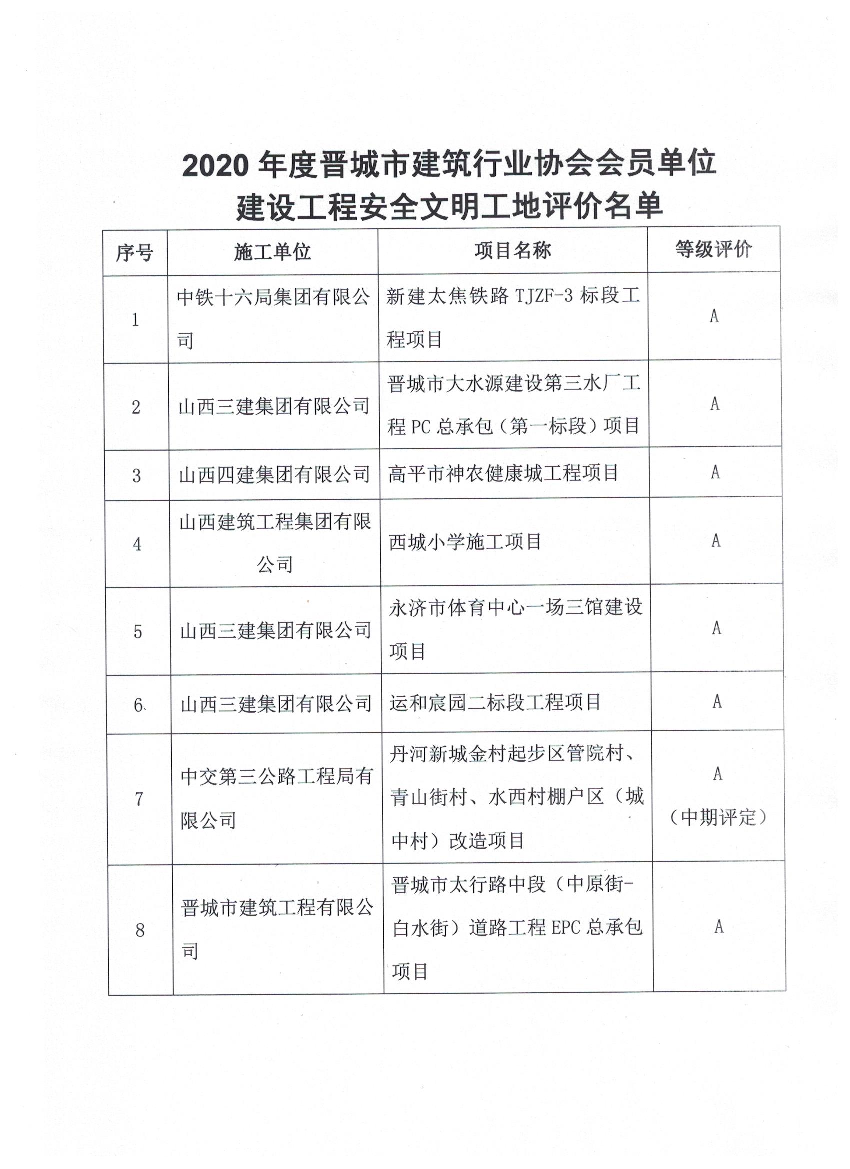 关于公布2020年度晋城市建筑行业协会建设工程******文明工地评价名单的通知