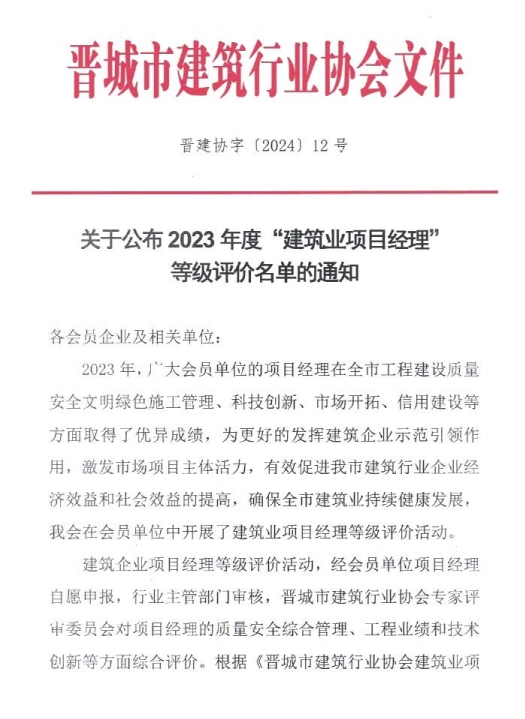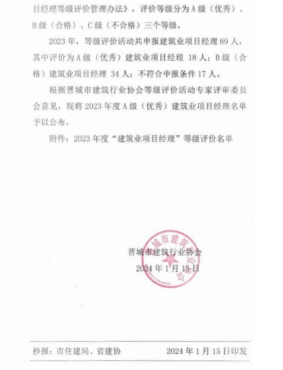 关于公布2023年度“建筑业项目经理”等级评价名单的通知