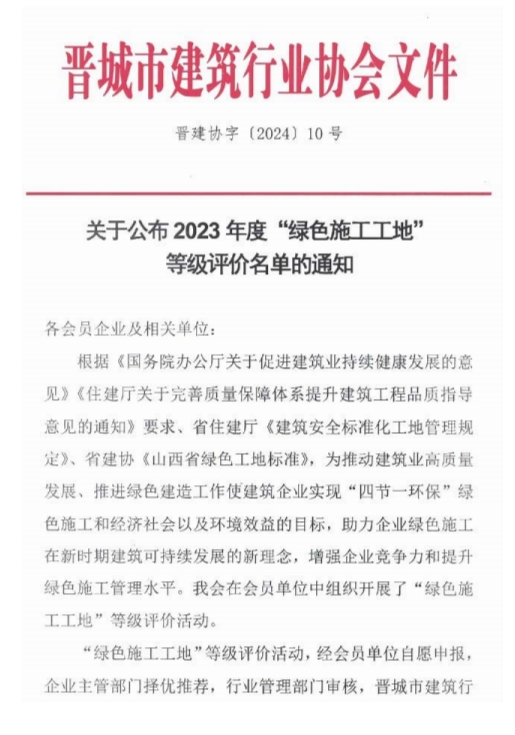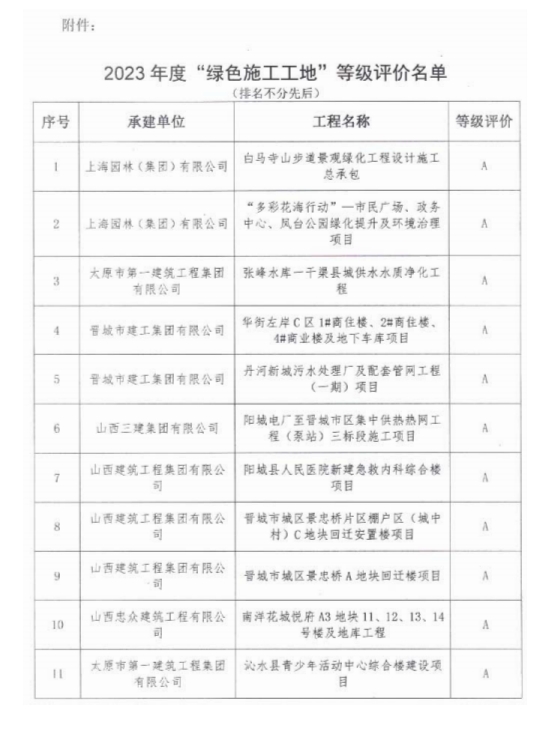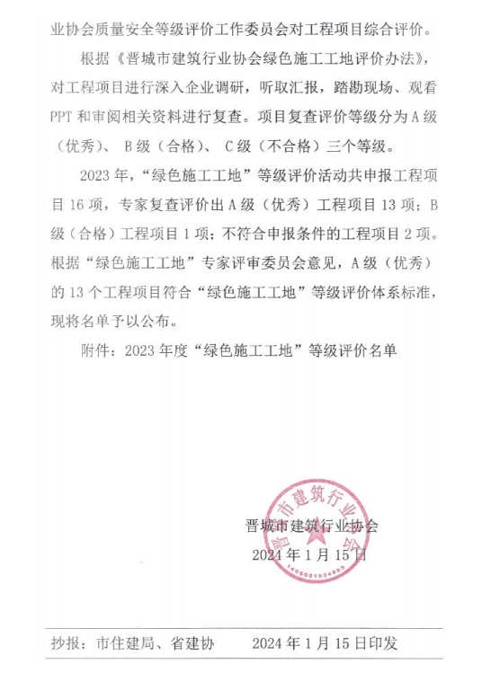 关于公布2023年度“绿色施工工地”等级评价名单的通知